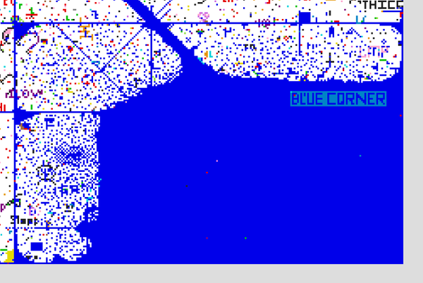 Они пришли с одной целью: «завладеть миром» — всем белым листом от края до края. Эти пользователи начали создавать «фракции»: первой и самой большой стало движение Синий Угол. В правом нижнем углу по всей площади белого квадрата вдруг угрожающе начало разрастаться синее пятно. Последователи тут же объявили свой манифест: завладеть Местом целиком. И у них это получалось — пиксель за пикселем.