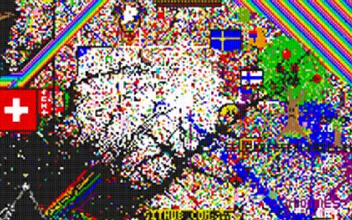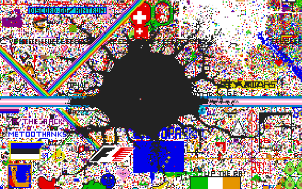Кто-то из пользователей нарисовал ряд сердечек, имитирующих старую видеоигру — другие тут же подключились и продолжили ряд до самого края полотна, раскрашивая сердечки в флаги разных стран.