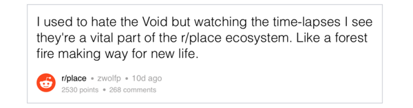 Парадоксально, но именно это требовалось Месту. Создатели были заняты выяснением отношением друг с другом. Защитники мерили свой успех размером контролируемой ими территории. А в это время прямо у них под носом появилась настоящая угроза. Они были вынуждены объединиться и спасти свое искусство, чтобы избежать исчезновения. Один за другим в комментариях люди начали высказывать мысль: Месту требовалось разрушение, чтобы на обломках возникло новое — и лучшее — искусство. Никто, кроме Пустоты, не мог взять на себя смелость очистить полотно целиком.