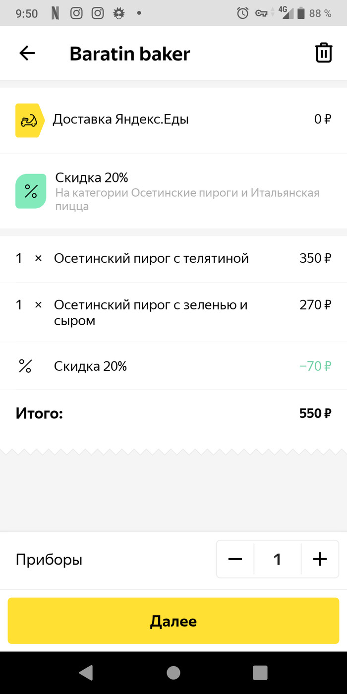 Честно говоря не думал, что в эпоху приложений по доставке можно столкнуться с банальным обсчетом. Яндекс еда показывает цены со скидкой, однако в итоговом чеке идет скидка только на первое блюдо. В поддержке признали наличие ошибки, обновите приложение(у меня последняя версия). Однако факт обсчета остаётся. Проверяйте счет даже в мобильном приложении