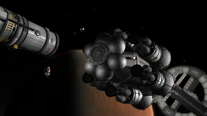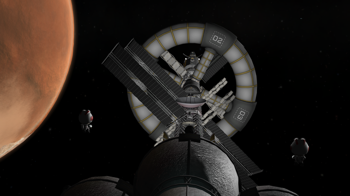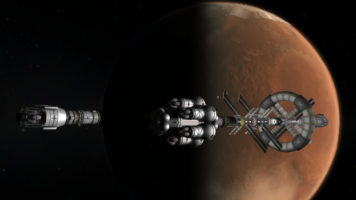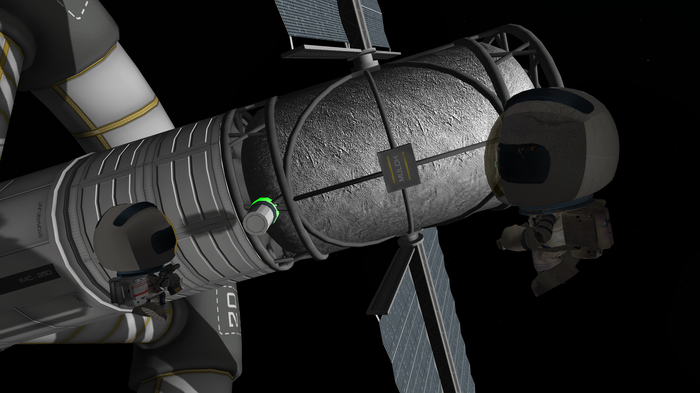 Через двадцать минут Галилей медленно поравнялся с Гермесом. Боб уплыл в отсек гидропоники, чтобы перенастроить систему жизнеобеспечения с учетом еще двух кербонавтов на борту. Джеб, долгое время наблюдавший за чщательно выверенными действиями Боба по управлению двигателями и системой ориентации корабля, самостоятельно выполнил тормозной маневр на малой тяге тремя двигателями. Скорость относительно Гермеса была мизерной, поэтому при таком маневре крайне важна точность. Впрочем, так или иначе большинство действий было автоматизировано и выполнялось не без помощи компьютера: столь крупный корабль не имел прямых органов управления. Когда двигатели закончили работу, Галилей замер вблизи потрепанного старшего брата. Джеб незамедлительно перелетел к обзорной куполе, чтобы взглянуть на предшественника своего корабля.