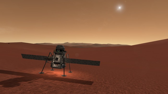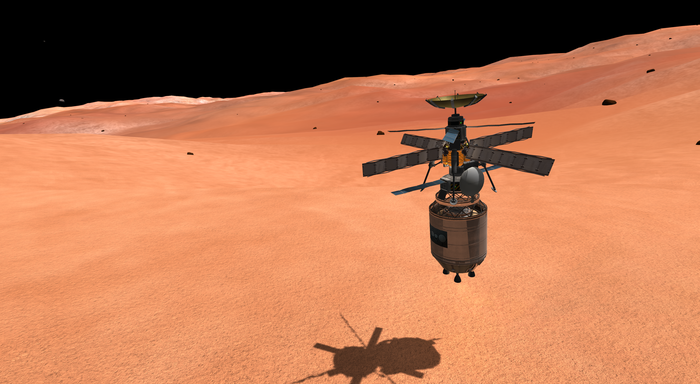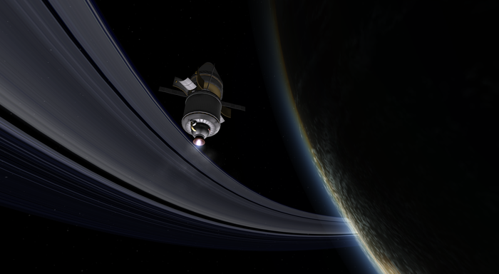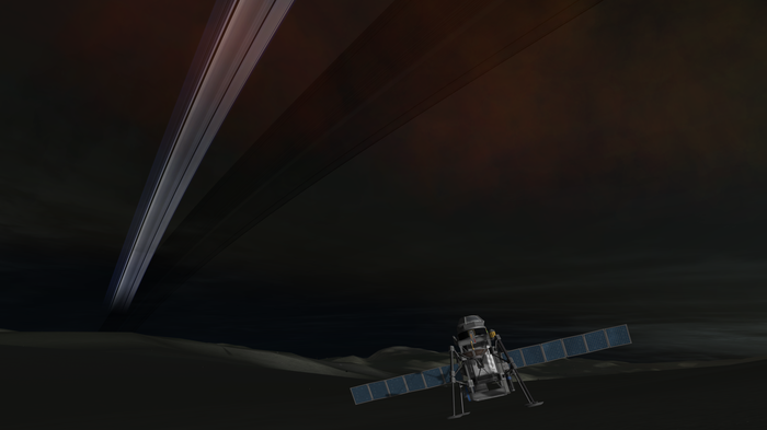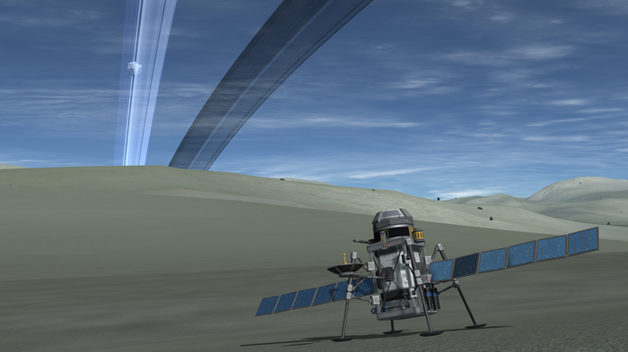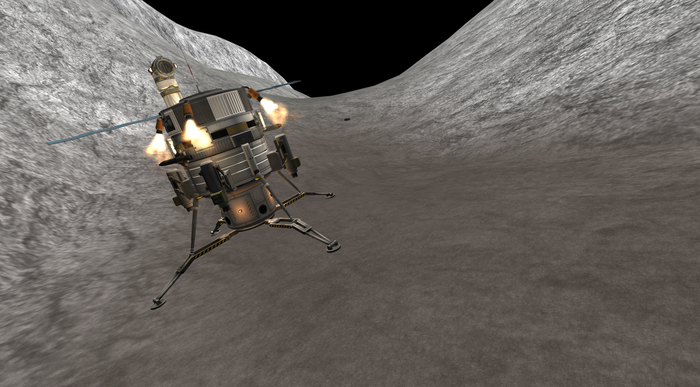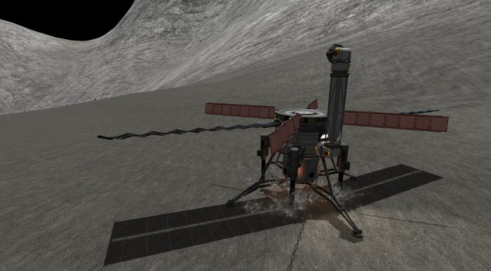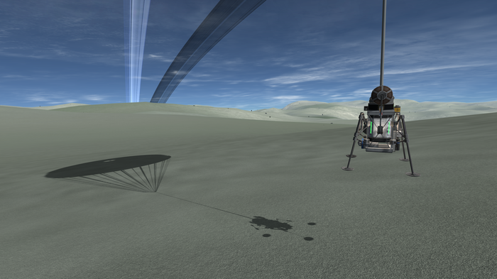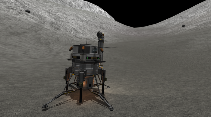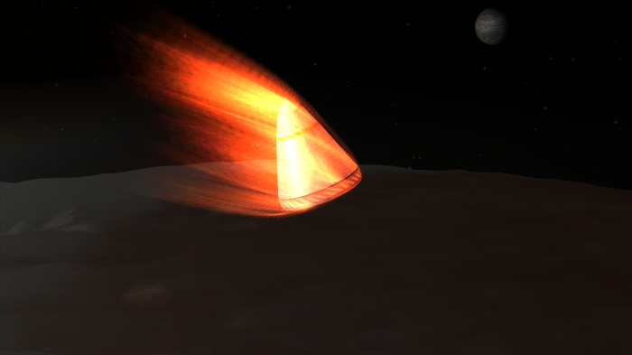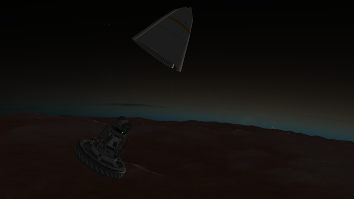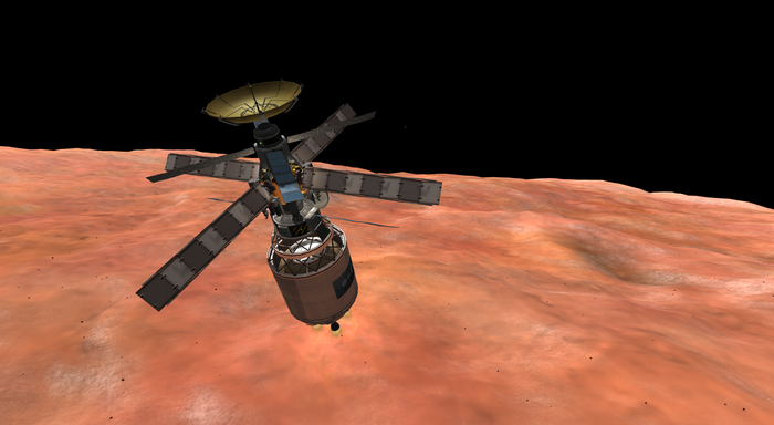 А лэндер тот же, что успешно сел на Нивен пару постов назад. Напомню: конус с обтекателем, тепловой щит, внутри слегка фарширован детальками SmartParts, автоматизирующих посад...
