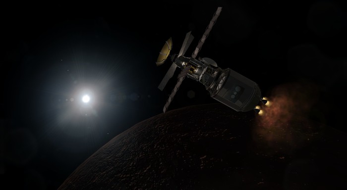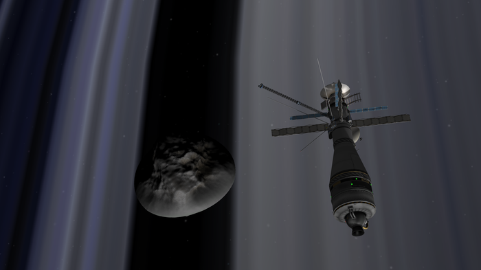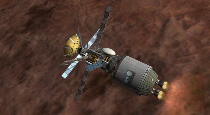 Осталось молиться на аэродинамическую стабильность посадочного модуля, поскольку управление мы получим теперь только на поверхности, а вход в атмосферу начнется боком вперед (своего гиродина спускаемый уппорат не имеет). Ах, да, и бортовые системы не забыть ввести в режим спячки: солнечные панели также остались на сервисном модуле.