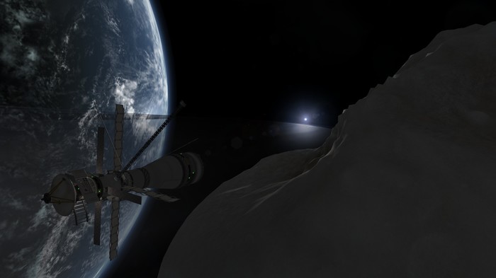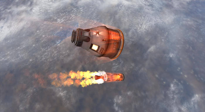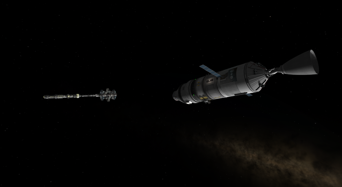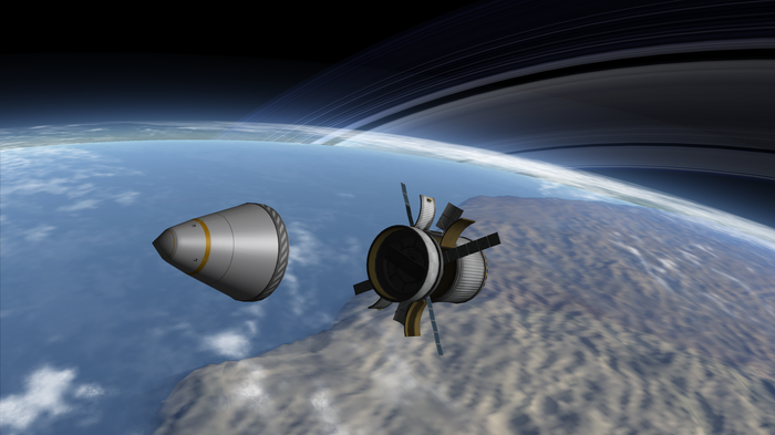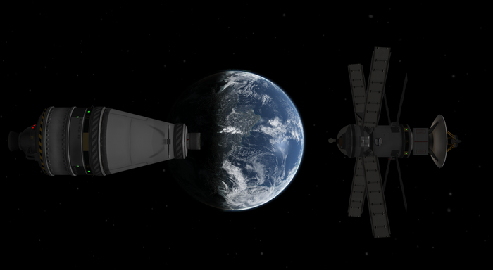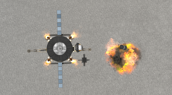 Честно говоря, было даже стремно запускать следующий автобус после такой аварии. К счастью, шанс такого взрыва весьма мал (1%), так что запуск прошел по плану и через полчаса перед иллюминаторами капсулы с двумя кербонавтами предстал силуэт отработавшего межпланетного корабля.