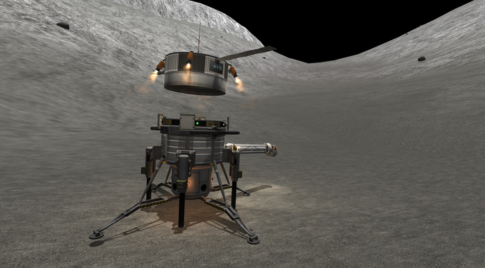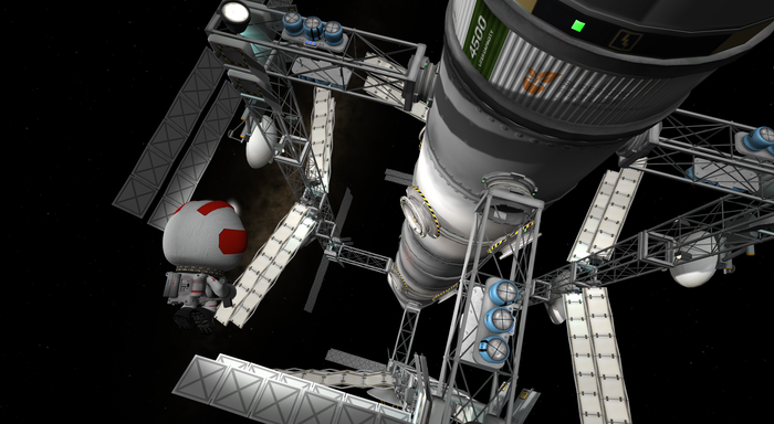 1) соорудить небольшую посадочную платформу из структурных панелей и докпортом в центре. Но это сложно - хрен попадешь точно на докпорт при посадке, а тогда понадобится ювелирное маневрирование, а тогда есть шанс сжечь конструкцию струями раскаленного газа из движков. Да и вообще сломать ее при посадке. Физика KSP - такая физика...