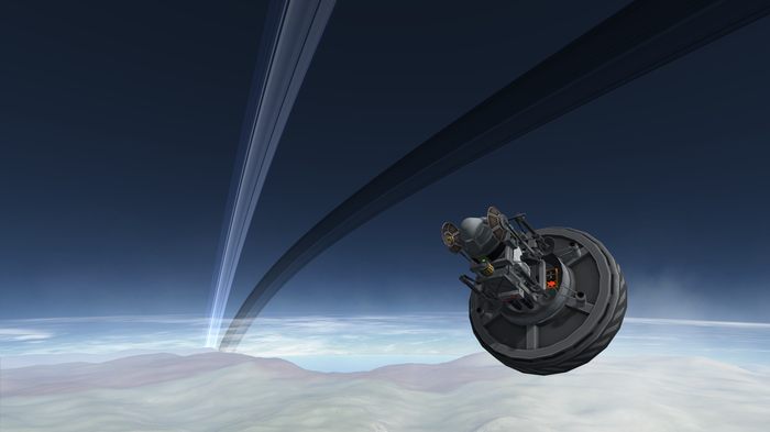 Вернее, вернусь сюда аж с двумя лэндерами. Дело в том, что у Теллюмо крайне агрессивная атмосфера. Она очень плотная и очень низкая: начинается на каких-то 45-ти километрах, а на уровне моря давление составляет аж 10 атмосфер. А если вспомнить, что сама планета еще и весьма массивная (5 масс Кербина), хоть и не очень крупная (1,000 км против 600 км Кербина), то сюда приплюсовываем еще и гигантскую орбитальную скорость в пять километров в секунду.