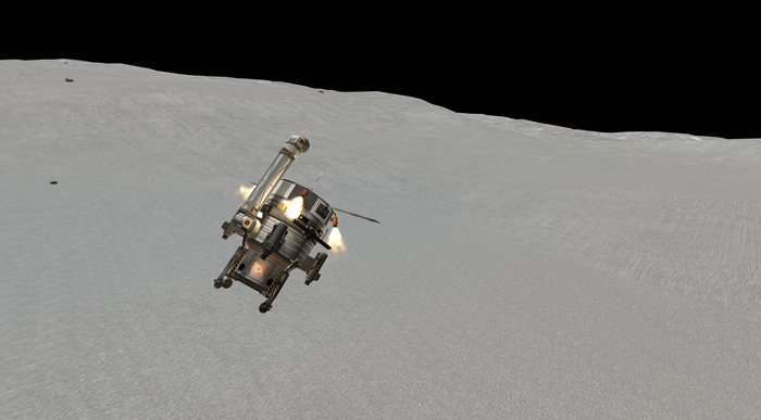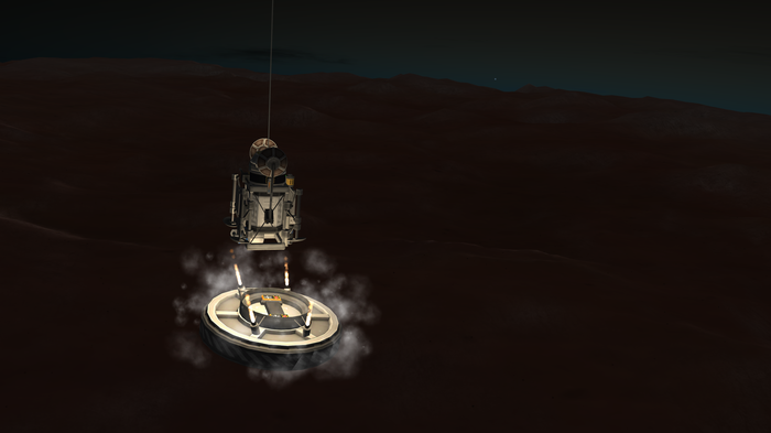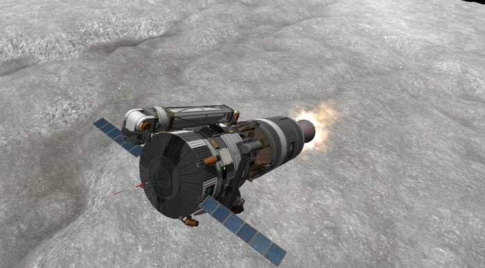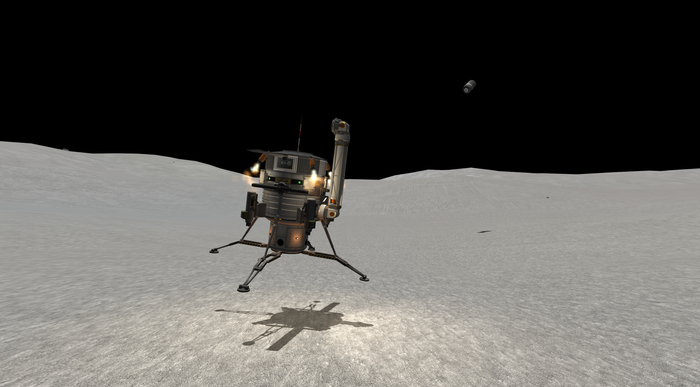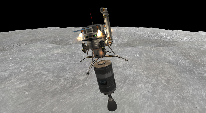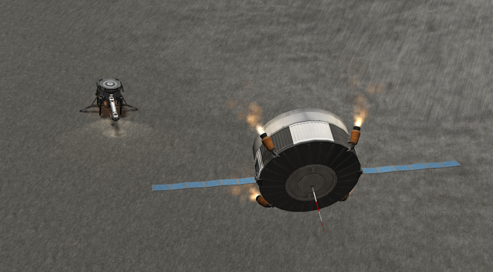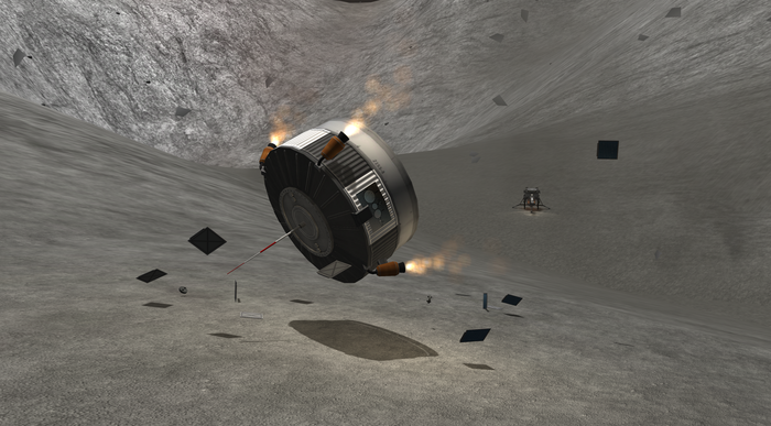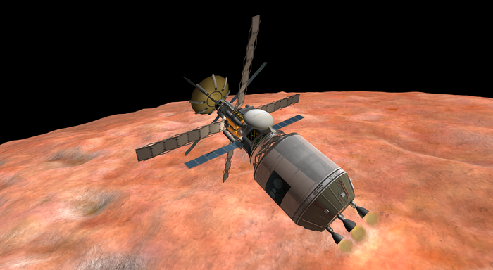 Также у Талии слабенькая гравитация, но покрепче минмусовской. Как сесть на посадочные опоры, но при этом оттормозиться? Очень просто (нет). Как сделал я: за секунду до полного погашения вертикальной скорости резко "вильнул" движком, придав лэндеру вращение, и отстрелил орбитальный модуль в надежде отскочить от него подальше и сесть хоть и жестко, но на "ноги". Получилось.. так себе. Все-таки по-кербальски. :)