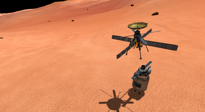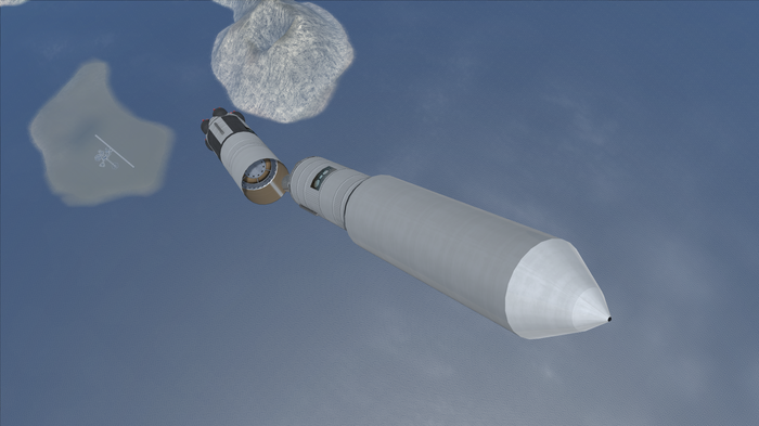 ...а на трех километрах - сброс теплового щита, базы обтекателя и, собственно, теперь уже лишней автоматики. Сделать это помогли 4 мощных твердотопливных сепратрона, которые быстро отвели плоскую и очень не аэродинамичную штуковину от посадочного блока. Причем двигатели распологаются под небольшим углом, чтобы придать немного горизонтальной скорости сбрасываемому блоку. Нам ведь не надо, чтобы он, поймав воздух, ударился об лэндер?