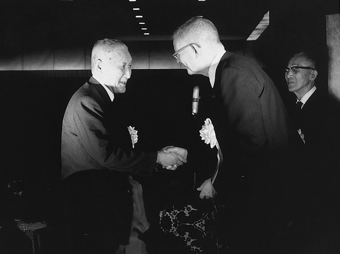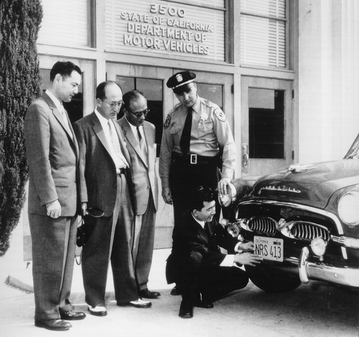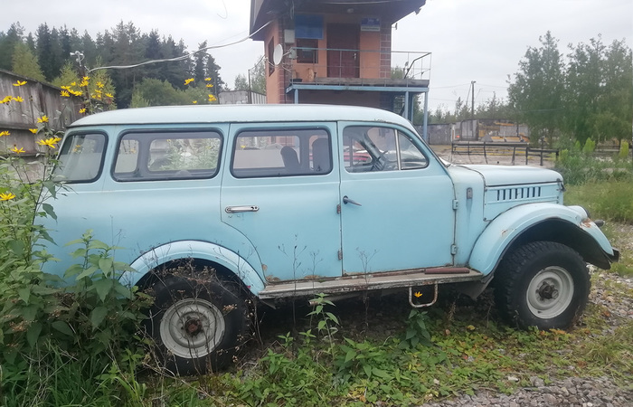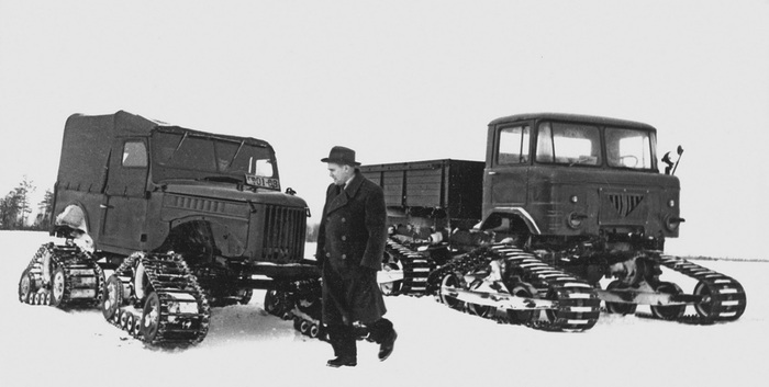 ГАЗ-69 с кузовом модели 76, опытный образец. За рулём — бессменный ведущий испытатель 69‑го Анатолий Фёдорович Ромачёв, стоят Григорий Моисеевич Вассерман и Борис Николаевич Панкратов. Оба в «наградных» драповых пальто, брюках фасона «трубы с парохода» поверх валенок без калош. Зима 1952 года.