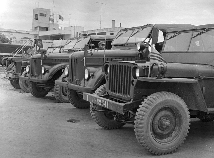 Вьетнамские ГАЗ-69 и французские Hotchkiss-M201 в аэропорту Зялам в Ханое, ожидают завершения переговоров между представителями ДРВ и французскими колониальными силами, 10 августа 1954 года.