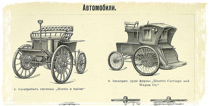 Электромобили. Иллюстрация из Большой энциклопедии под ред. С. Н. Южакова издания начала ХХ века.