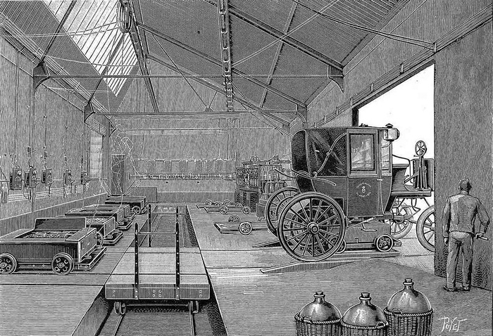 Зарядная станция сетевой транспортной конторы на ул. Кардине в 17‑м округе Парижа, гравюра Луи Пуайе (Louis Poyet, 1846–1913). Представленная здесь система быстрой смены батарей сейчас получила новую жизнь в Китае.