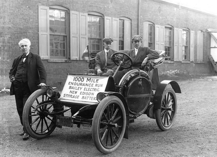 Томас Эдисон (слева) у электромобиля фирмы S.A. Bailey & Co., совершивший 1000‑мильный испытательный пробег. За рулем испытатель капитан Лэнгдон (W. Langdon), рядом — конструктор фирмы Эдисона, Фрэнк МакГиннесс (Frank McGuiness), 1910.