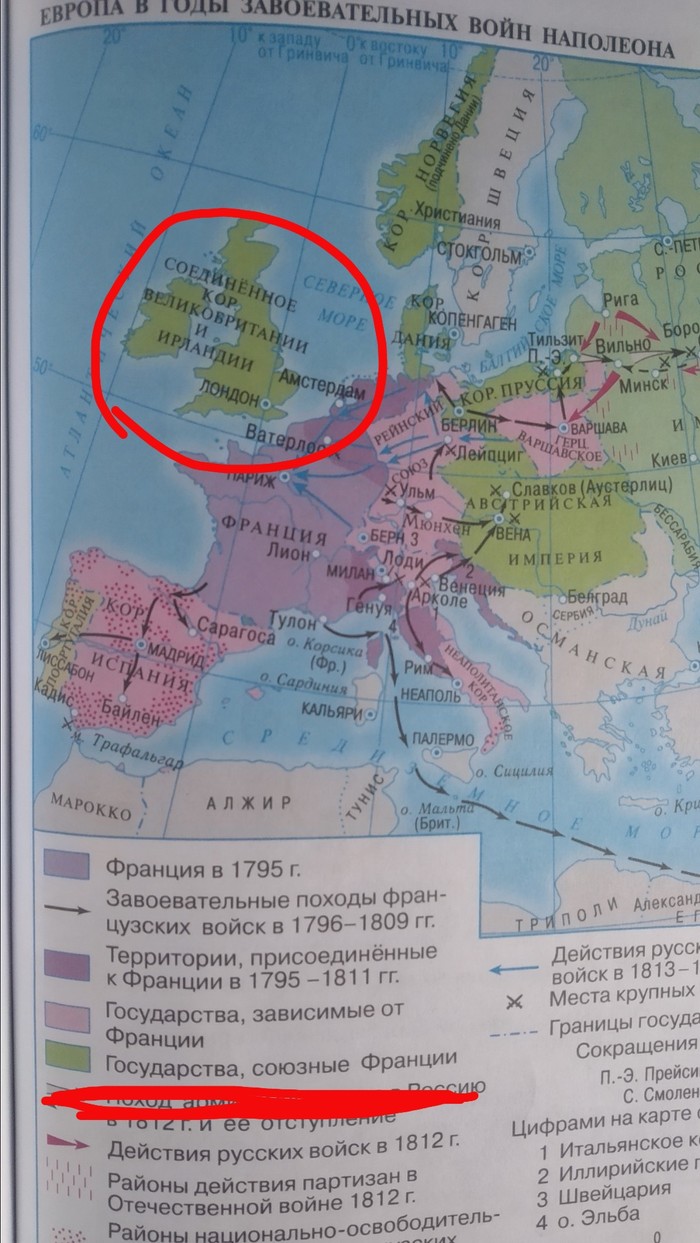 Нам действительно показывают что во времена Наполеоновских завоеваний, Британия, Австрия, Пруссия, Дания и Норвегия были союзниками Франции!(прошу обратить внимание на то что Великобритания выглядит светлее из-за лампы, светящей на учебник) Как? Ведь этот учебник делали люди знающие историю! Но ещё более интересно то, что этот учебник одобрили в министерстве образования и ни один учитель не заметил этой, я даже не знаю ошибки или опечатки!