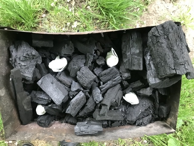 Поджигаем. Как бумага разгорится, сверху подкладываем угли.