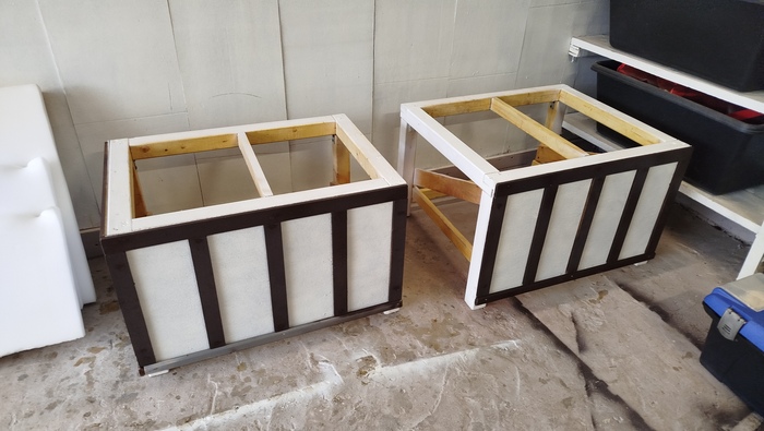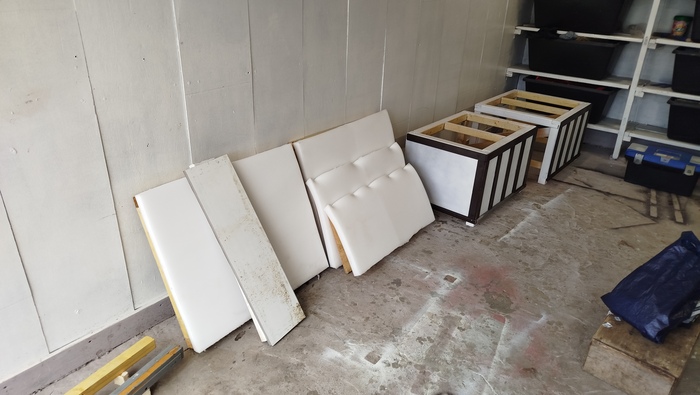 Собираем каркас сидений, 50*70см высотой 45см. Нарезаем фанеру 50*70, крепким паролон строительным степлером . После обрабатываем олифой в два слоя, красим краской.