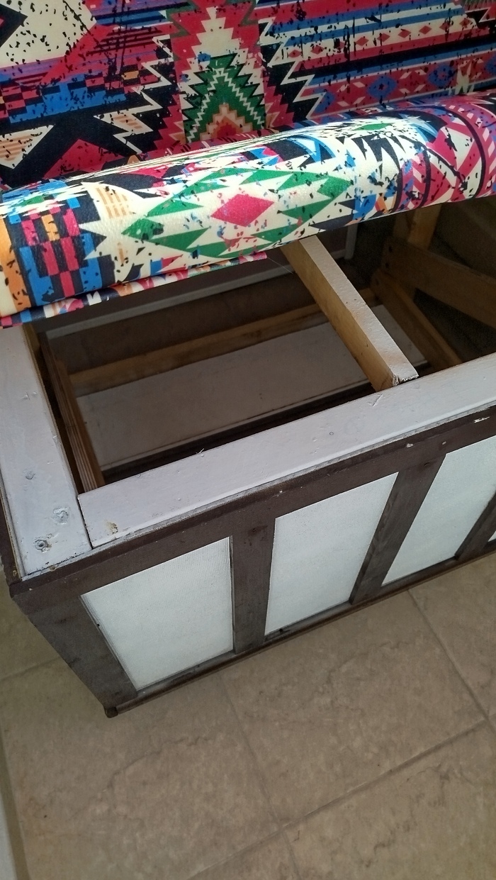 Крепим паролон строительным степлером, натягиваем ткань, крепим также степлером, крепим сиденья к каркасу на петли, чтобы получилось подобие сундука для хранения всего необходимого .