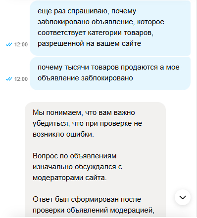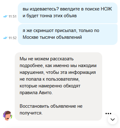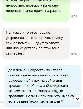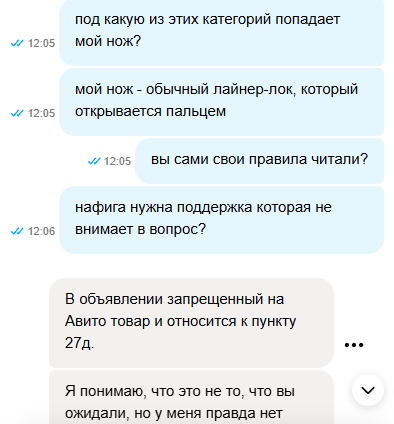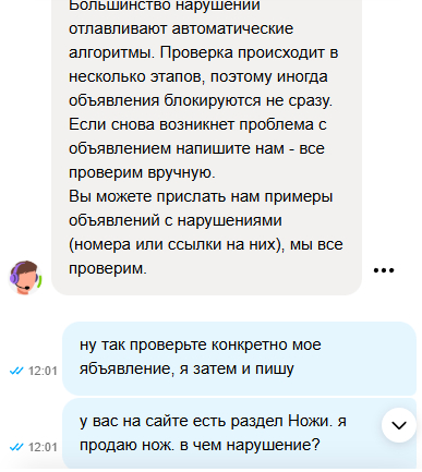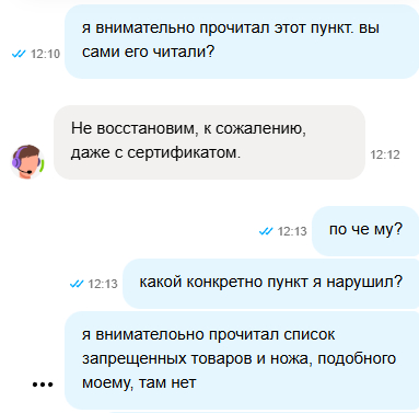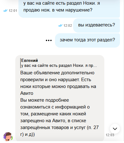 Пишу в поддержку, мне тут же прилетает ответ от бота что продажа ножей запрещена. Я сразу спрашиваю какого фига тогда категория "Ножи, мультитулы, топоры" делает на сайте?