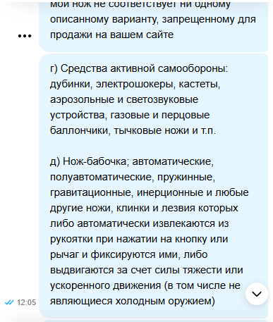Жду оператора, от него сразу прилетает "ололо, холодное оружие, низзя" и ссылка на список товаров, запрещенных к продаже и конкретно на пункт про ножи.