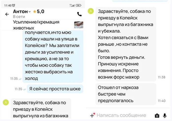 На вопрос от хозяев в переписке этот "прекрасный" специалист (некто Антон) поначалу сослался на форс-мажор, мол, пардоньте, за время пути собака резко очнулась и убежала, таки дела, да...