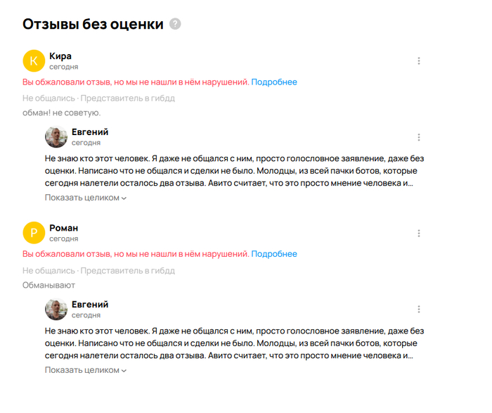 Авито. Нашествие ботов в отзывы и невозможность удалить оценочное суждение пользователя