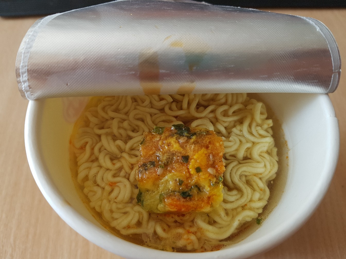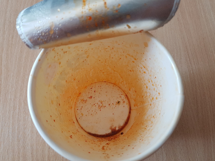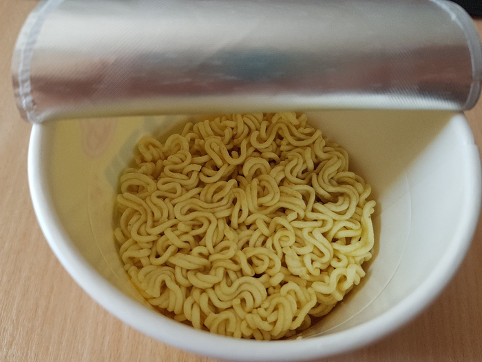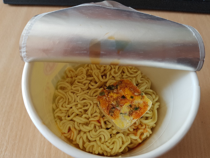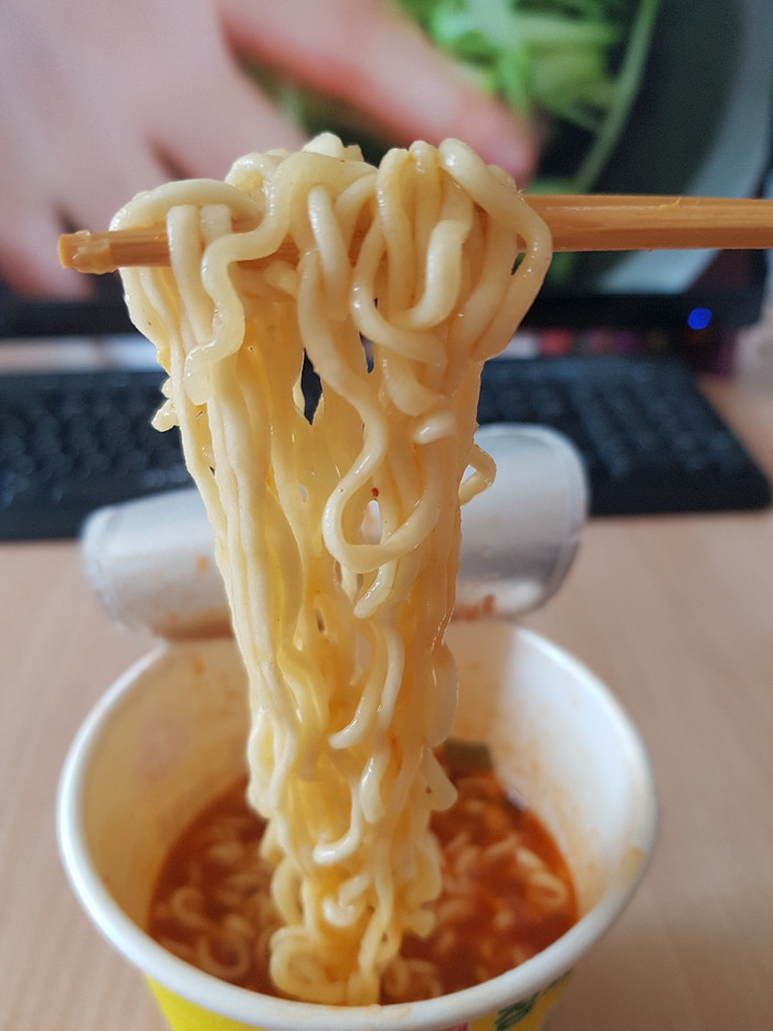 М-м-м-м, вкусняшка! Довольно яркий, жарено-кунжутный вкус с нотками чего-то мясного и нашим любимым чили. Вы заметили, что на этикетке не было значков типа HOT или Spicy? То-то же. А острота примерно в 2 раза превышает красный дошик, и по мере продвижения к дну стаканчика увеличивается. Поэтому не забываем помешивать (я забыла :()!