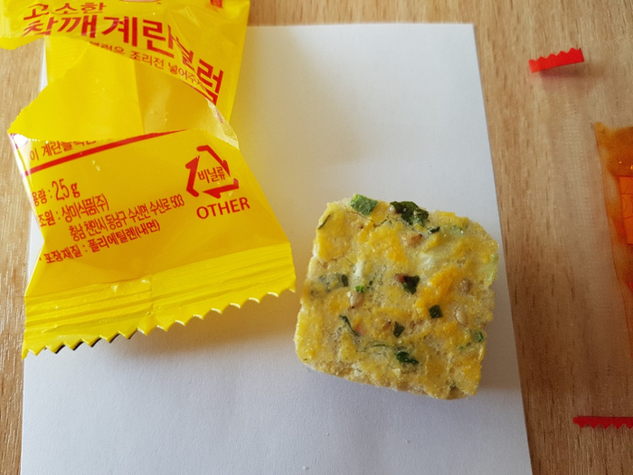 Вскрываем наш "бульонный кубик", рассматриваем. Оказывается, что это никакой не корейский "магги", а прессованный омлет вперемешку с зеленым луком и кунжутом. Кидаем в стакан с лапшой, вроде бы это правильно по инструкции.
