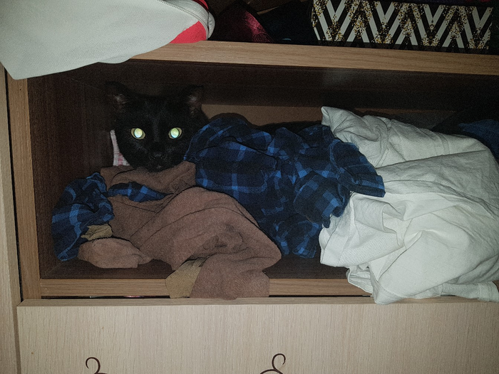 И, напоследок, фото моего котана, схоронившегося среди шмотья.