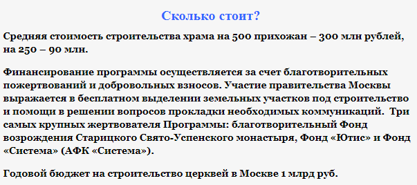 Я не буду ничего утверждать, но лично мое мнение что все это хороший такой распил бабла, в котором участвует и РПЦ, и застройщик, и подрядчик. А люди несут свою мелочь в храм и думают, что деньги идут на строительство.