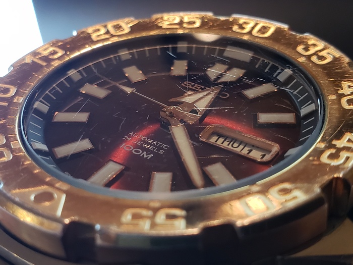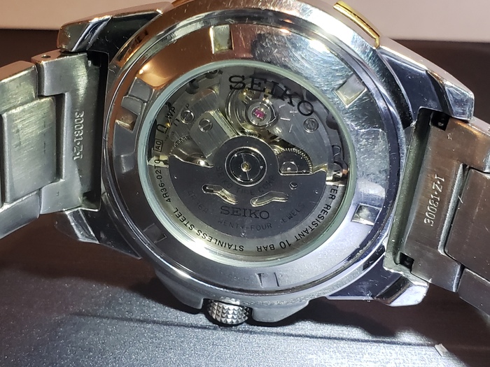 Вид сзади не такой уж благородный как у Tissot. Как вы уже догадались - это тоже механические часы с автоподзаводом. С такими выямками по кругу очень легко снять заднюю крышку. Кстати, часы легко разбираются и пригодны для "ремонта" в полевых условий, в отличии от Tissot. У обоих часов отваливался индикатор от циферблата, но Tissot приходилось отдавать мастеру на сутки, когда Seiko легко разбирался при помощи Youtube и инструментов с тягача.