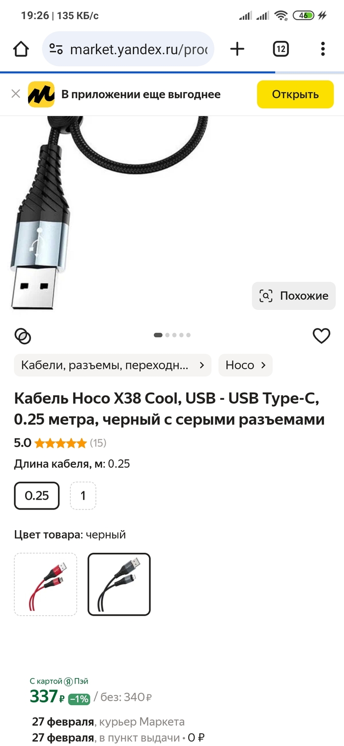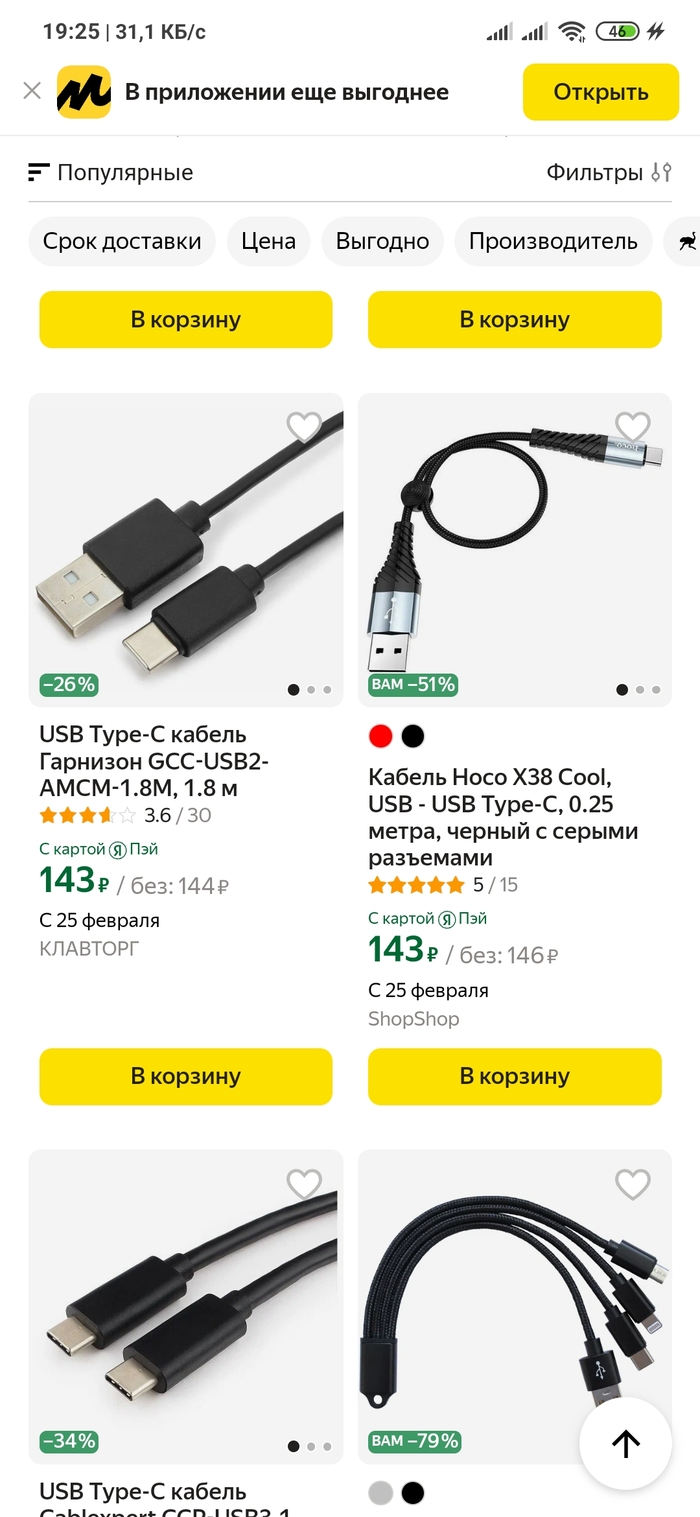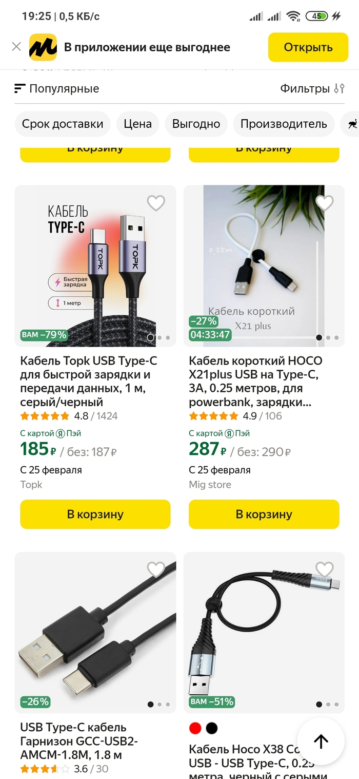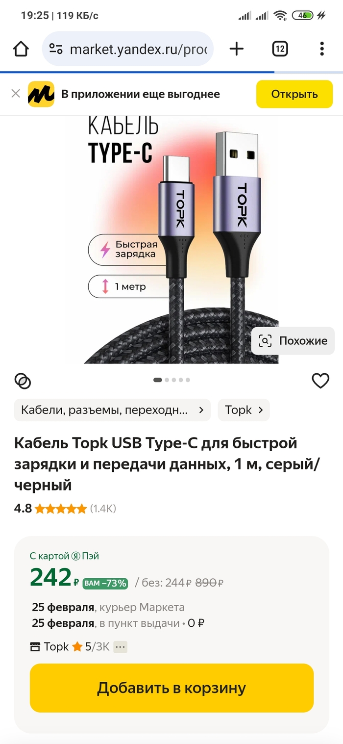Кабель Topk USB - Type-C, 185 руб. Открываем или кладём в корзину - 242 руб!!! Ого! Да ещё и со скидкой огромной!!!
