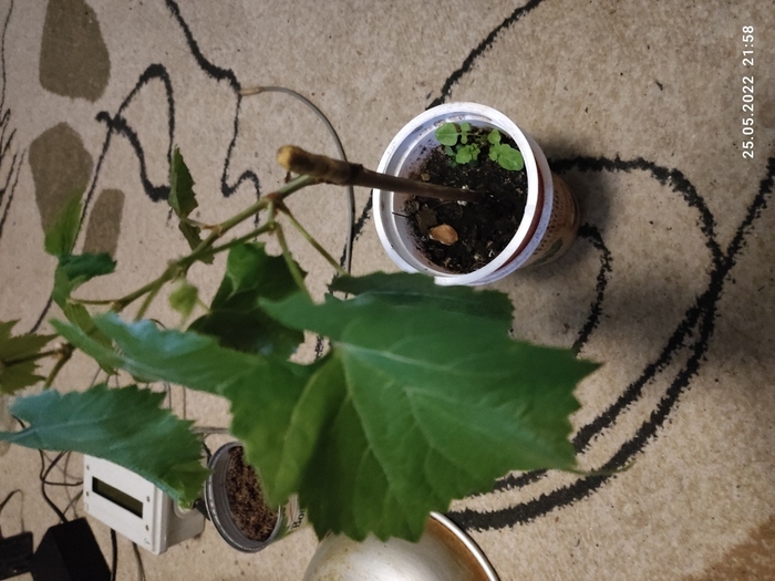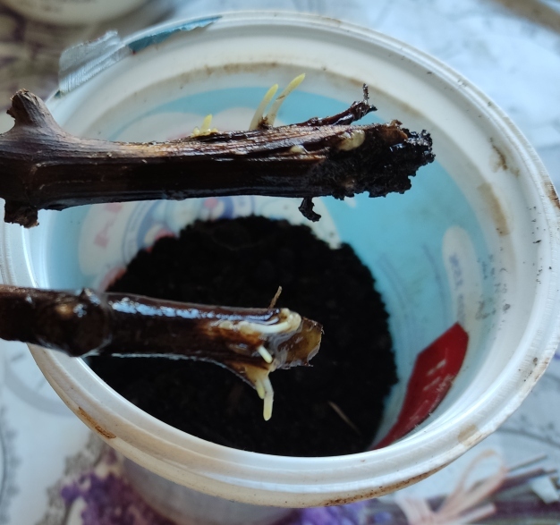 Накрыл их тарелкой. Обернул все газетой для теплоизоляции. На тарелку поставил банку из под горошка с субстатом кокоса. В него поместил черенки и датчик температуры. Подключил терморегулятор. Температуру подогрева выставил +25град. Все поместил в кессон(погреб в гараже). Там +10 град.