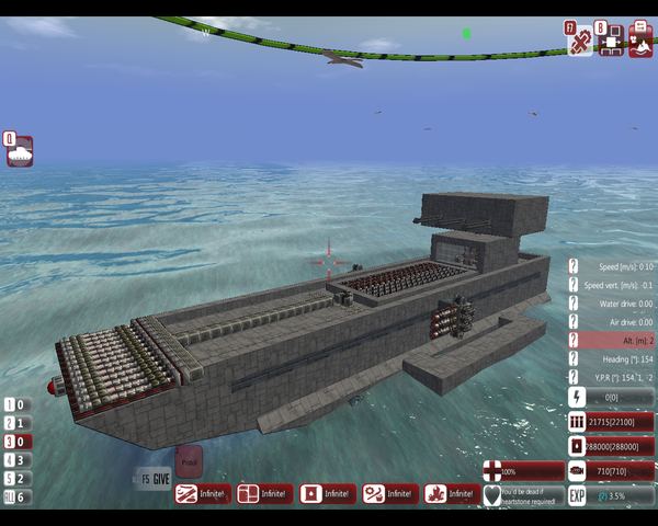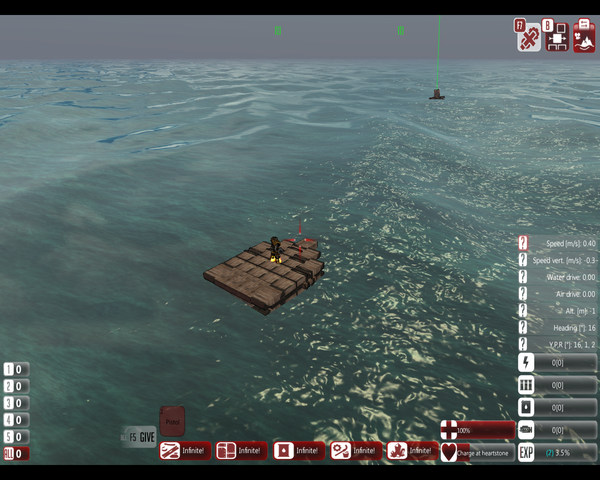 Сам игровой процесс, состоит из постройке транспорта (корабля, самолета) и нормальной настройки его, в добавок, создание своих ракет, снарядов для пушек, создание самих пушек, множество попыток понять как что работает (я лично во время постройки двигателя что-то поломал, и лодка плыла только налево). Вот например вы начнете на этом плоту (графоний на минималках у меня)