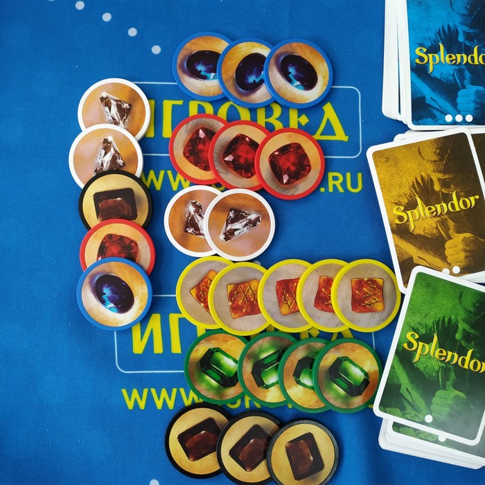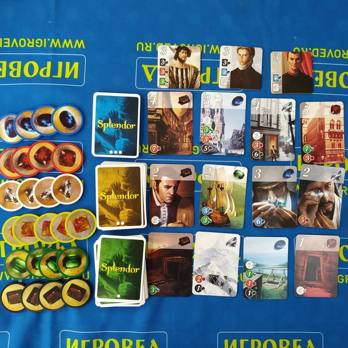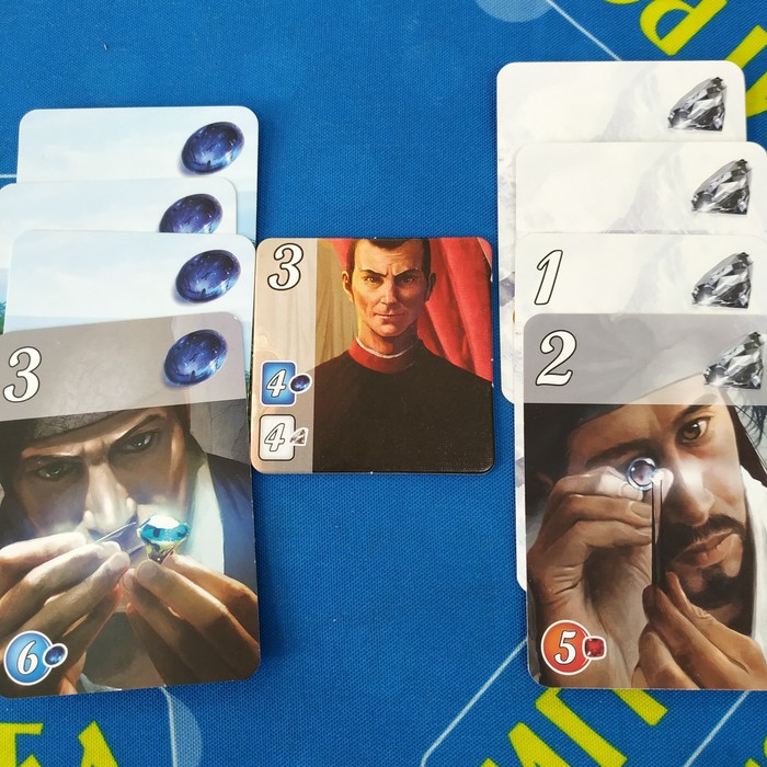 Для игры вдвоем необходимо убрать несколько фишек "драгоценностей" (жетоны с левой стороны), так чтобы осталось по 4 жетона, кроме "золота". Жетонов "золота" в игре всего 5 штук и они играю роль "джокера" - заменяют собой любую "драгоценность".