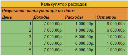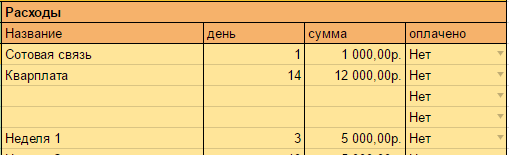 В предыдущем посте я разделил калькулятор на 4 зоны: расходы по дням(1), калькулятор в разрезе по дням(2), доходы(3) и расходы(4). В новой версии калькулятора отсутствует первая зона. Расходы по дням уходят в зону расходы(4) и планируются понедельно.