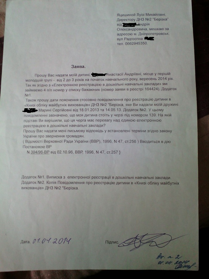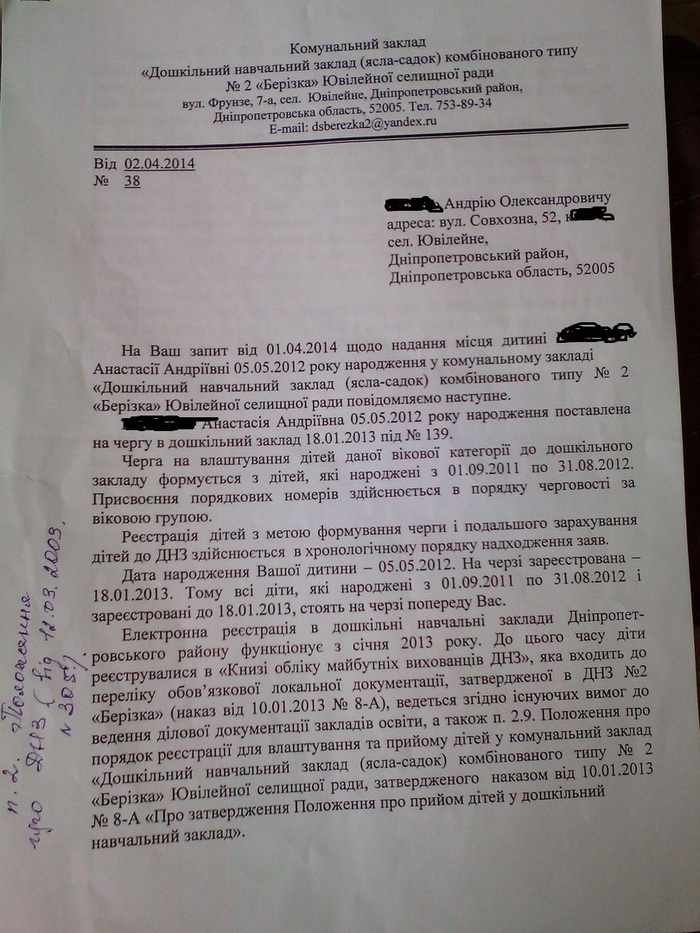 Дальше я опять, написал при них запрос на имя уже этой тетки из районо, чтобы мою дочь приняли в сад. Через две недели получил ответ. (Сделал это дабы подстраховаться)
