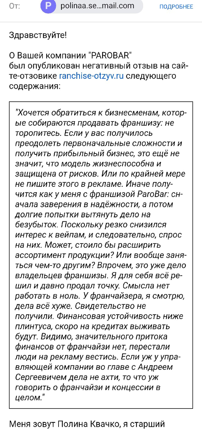Сегодня мы получили "письмо счастья" от некой организации "доброжелателей" (virgin-media.ru). Стоит отметить что франшиза у нас действительно есть, но вот закрытых или продавших магазины франчайзи пока не видели. "доброжелатели" за скромную таксу готовы работать с отзывами в интернете, и с этим отзывом на данной площадке (franchise-otzyv.ru) в частности.