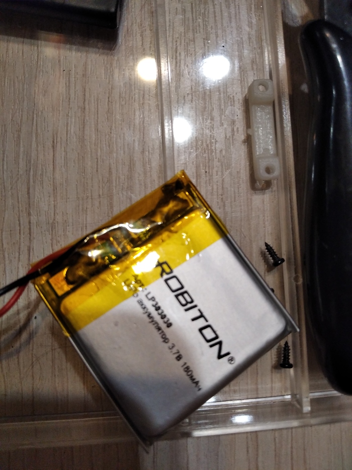 Батарея по маркировке была 3,7 вольт, 120 мА/ч. Нашел подходящую по вольтажу и с большим запасом по емкости от старого телефона, припаял с соблюдением полярности, провода вывел через корпус варварским способом.