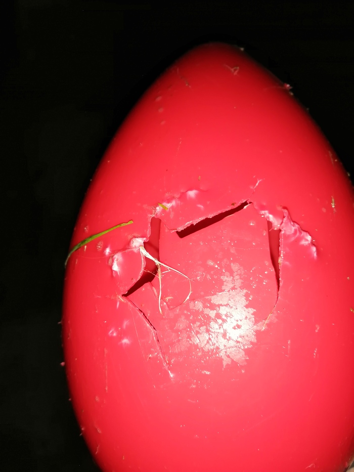 При ударе яйца об камень, оно обзавелось шикарной дыркой и многочисленными трещинами. Пластик тонкий и хрупкий. Мы побоялись, что острые края поранят дёсны и игру закончили.