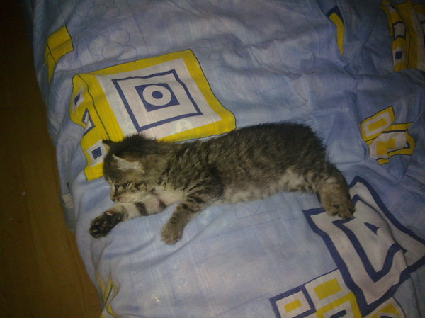 Подобрал дождливой ночью беззубого, беспрерывно мявкающего и только-только открывшего на наш говёный мир глаза котёнка. Выходил. Научил пользоваться лотком и просто умываться. Не мудрствуя лукаво, назвал Муркой :) Теперь это жизнерадостный, любопытный и игручий комок шерсти примерно двух месяцев. Хотел оставить себе, но вот хозяин квартиры против. Котейка не точит когти (тупо подрезаю), гадит СТРОГО и ИСКЛЮЧИТЕЛЬНО в лоток, но хозяина переубедить не смог.