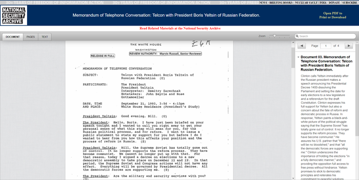 В США рассекретили запись телефонного разговора Ельцина и Клинтона от 21.09.1993, за 2 недели до расстрела Верховного Совета.