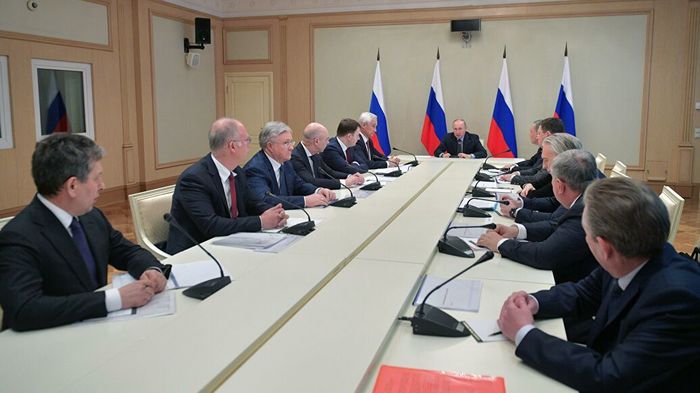Совещание по ситуации на глобальных сырьевых рынках в связи с коронавирусом с участием Владимира Путина, представителей кабмина и нефтяных компаний, Март 2020