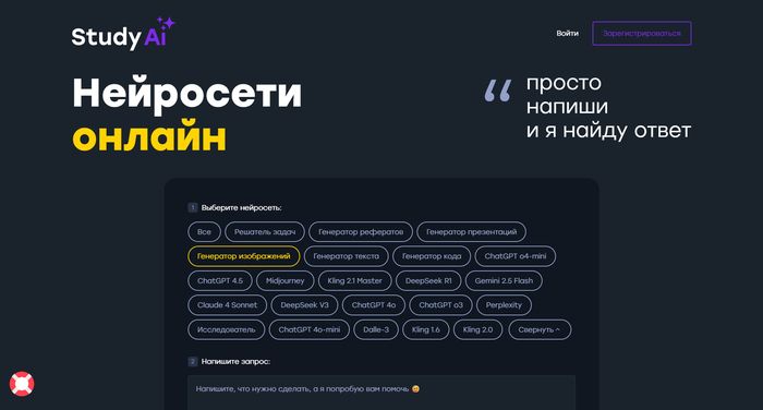 Study AI объединяет Midjourney и DALLE 3 в удобный русскоязычный интерфейс, работая без VPN, регистрации в Discord и знания английского языка. Достаточно ввести запрос на русском – система переведёт его и мгновенно сгенерирует изображения.