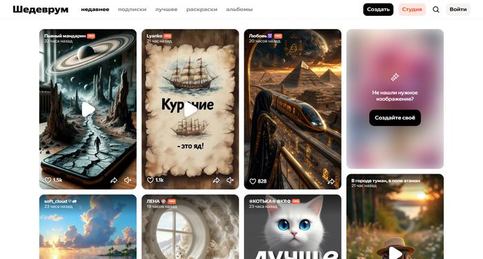 Шедеврум — онлайн-сервис от Яндекса, который позволяет пользователям создавать уникальные изображения и короткие видео с помощью нейросетей. Интуитивный интерфейс позволяет генерировать работы на основе текстовых подсказок (промптов), просматривать творения других пользователей и подписываться на авторов. Также доступна студия для обработки загруженных картинок и экспериментальной работы с новыми моделями.