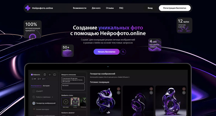 Нейрофото.online — это удобная веб‑платформа для создания уникальных изображений на основе текстовых запросов. Интерфейс позволяет буквально за несколько секунд преобразовать идею в визуал. Сервис предлагает генерацию картинок, улучшение качества фото, удаление фона и наложение эффектов — всё это работает прямо в браузере, без установки программ, как на ПК, так и на мобильных устройствах.