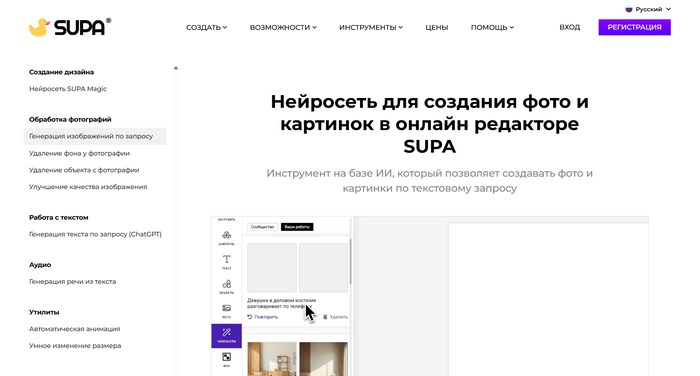 SUPA Magic — встроенная в онлайн-редактор SUPA нейросеть, создающая фотореалистичные картинки и иллюстрации по текстовому запросу. Она построена на продвинутых моделях глубокого обучения и позволяет создавать изображения, которые часто невозможно отличить от настоящих. Доступны заготовленные стили и гибкая настройка: пользователи могут выбирать акварель, киберпанк, стимпанк, классический реализм и другие варианты. Поддерживается ввод промптов на русском и английском языках.