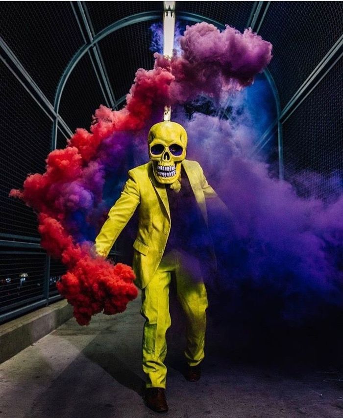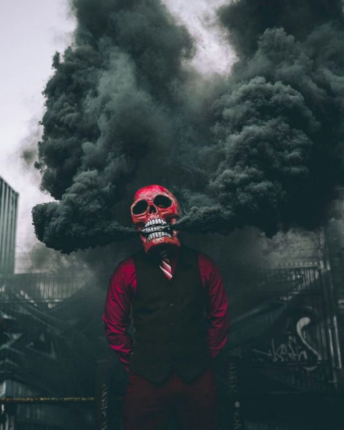 При этом сами дымовухи на фотографиях держит не только в руках, но и в зубах, в ушах, и даже в другом черепе (очевидно, отдавая дань уважения Уильяму нашему Шекспиру).