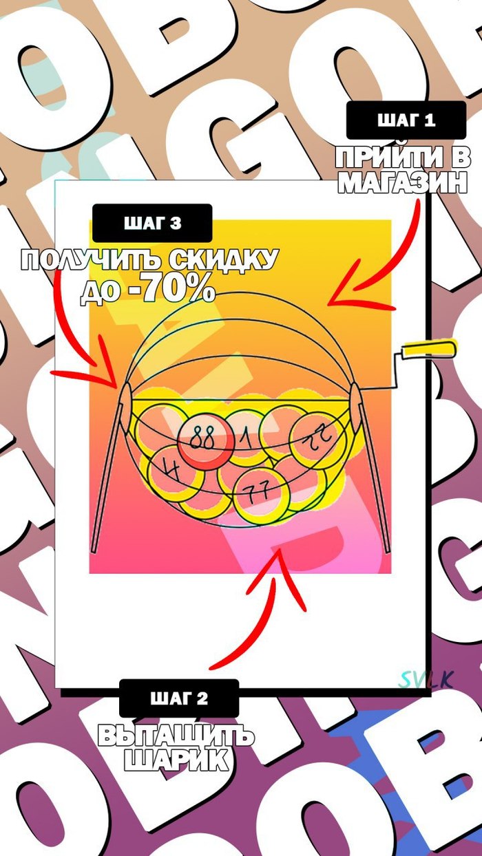 Сторис для инсты, нужны было описать механизм получения скидки в магазине с лотереей. Заплатили 200р. Оцениваю 10/10.
