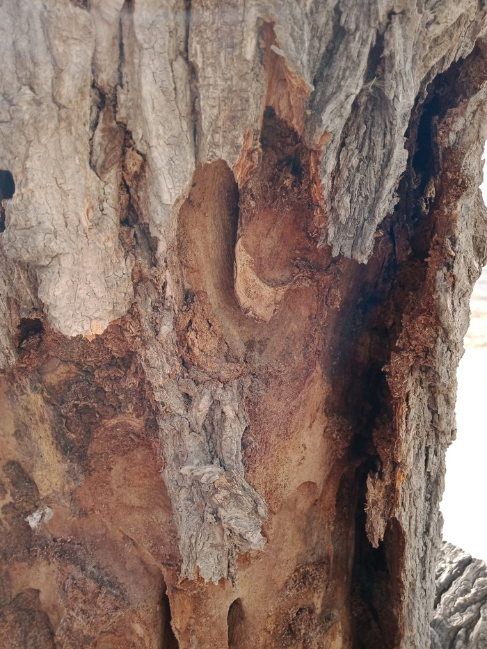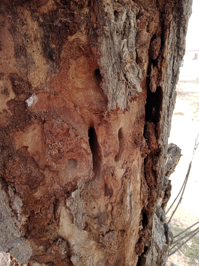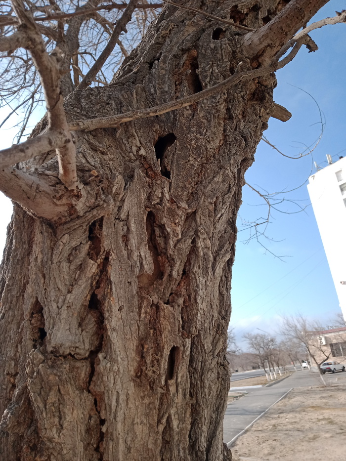 Гуляя по городу,заметил на деревьях отверстия,оставленные каким-то вредителем. Прогрызенные каналы очень большого размера,на обычных точильщиков не похоже. Встречается в основном на карагаче.На других деревьях не заметил. Если эта байда поселилась вдереве - дереву кирдык. Расположение деревьев - Актау(Шевченко),Казахстан