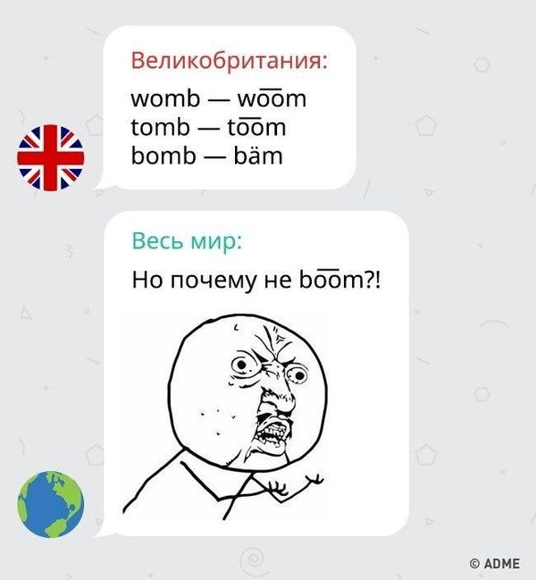 1419 bimboy Загадочный английский 8 лет назад Показать полностью 10 Мемы Английский язык Странности ADME Длиннопост
